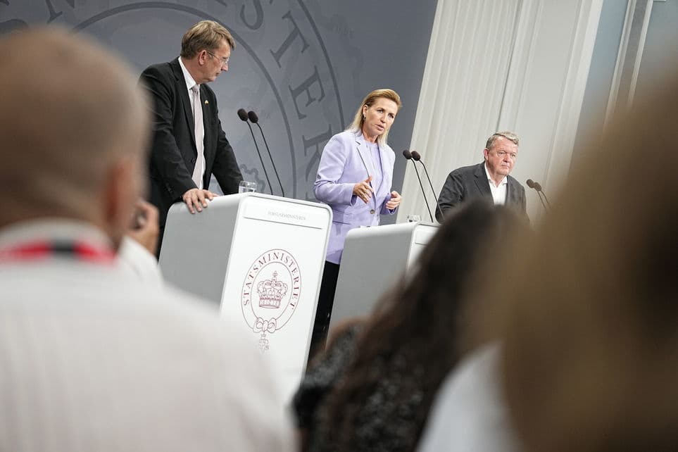 Vicestatsminister og forsvarsminister Troels Lund Poulsen (V), statsminister Mette Frederiksen (S) og udenrigsminister Lars Løkke Rasmussen (M) under pressemøde om den kommende politiske sæson i Statsministeriet onsdag. | Foto: Mads Claus Rasmussen/Ritzau Scanpix