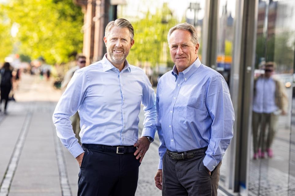 Christian Lindskov Alsø, adm. direktør i Bravida Danmark (tv.) og Lars Sandahl Sørensen, adm. direktør i Dansk Industri (th.). | Foto: Ulrik Jantzen