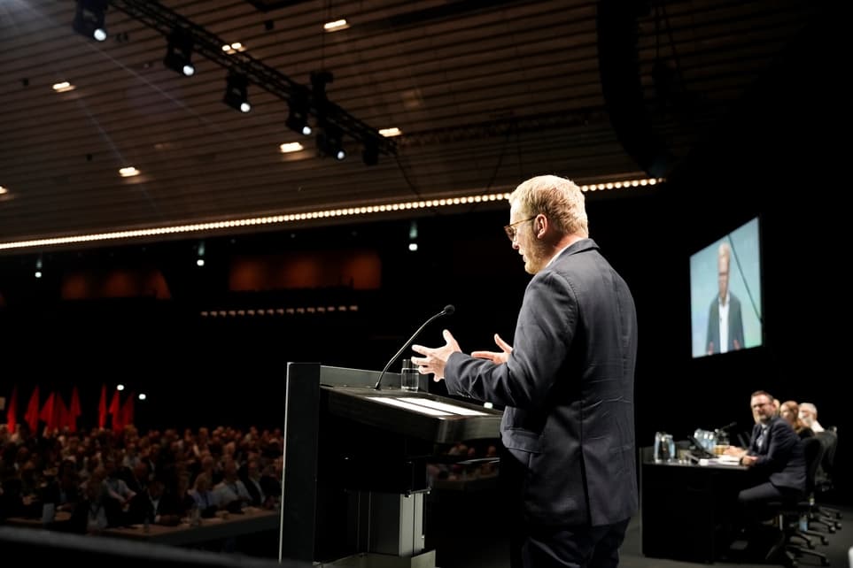 Morten Skov Christiansen blev valgt ved såkaldt akklamation og kunne efter mere end et minuts stående klapsalver holde takketale på scenen i K.B. Hallen. | Foto: FH