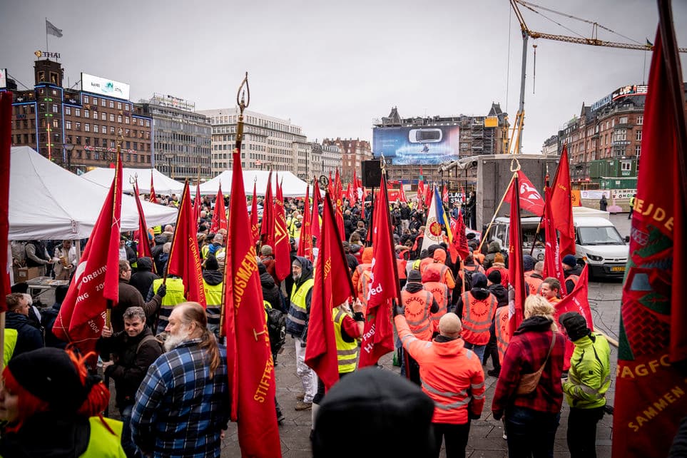 Der blev ikke luftet ligeså mange røde faner foran Forligsen, som forventet i januar. Her markeres opstart af byggeriets forhandlinger på Rådhuspladsen. | Foto: Mads Claus Rasmussen/Ritzau Scanpix