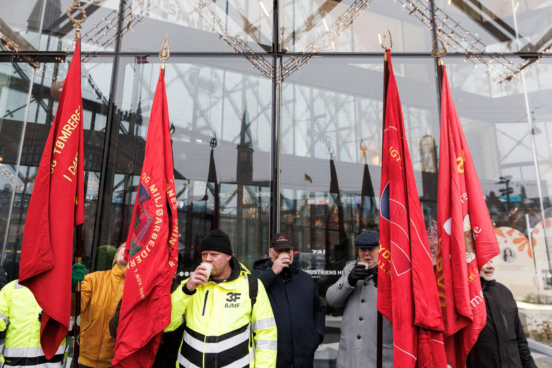 Mandag blev OK25 skudt i gang med et pressemøde i Industriens Hus. Foran bygningen havde fagbevægelsen trodset vejret for at hejse de røde faner. | Foto: Ólafur Steinar Rye Gestsson/Ritzau Scanpix