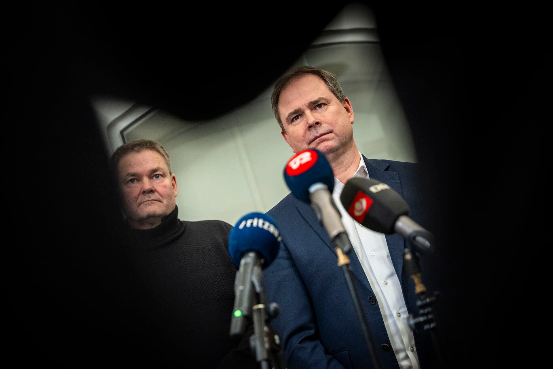 Finansminister Nicolai Wammen (S) og formand for Centralforeningen for Stampersonel Jesper Korsgaard Hansen til doorstep i Finansministeriet 11. februar 2024, efter at overenskomsten for statsansatte var faldet på plads. | Foto: Emil Nicolai Helms/Ritzau Scanpix